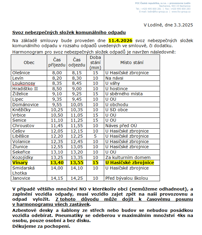 Rozpis svozu nebezpečných složek komunálního odpadu, který proběhne v našich obcích dne 11.4.2026.